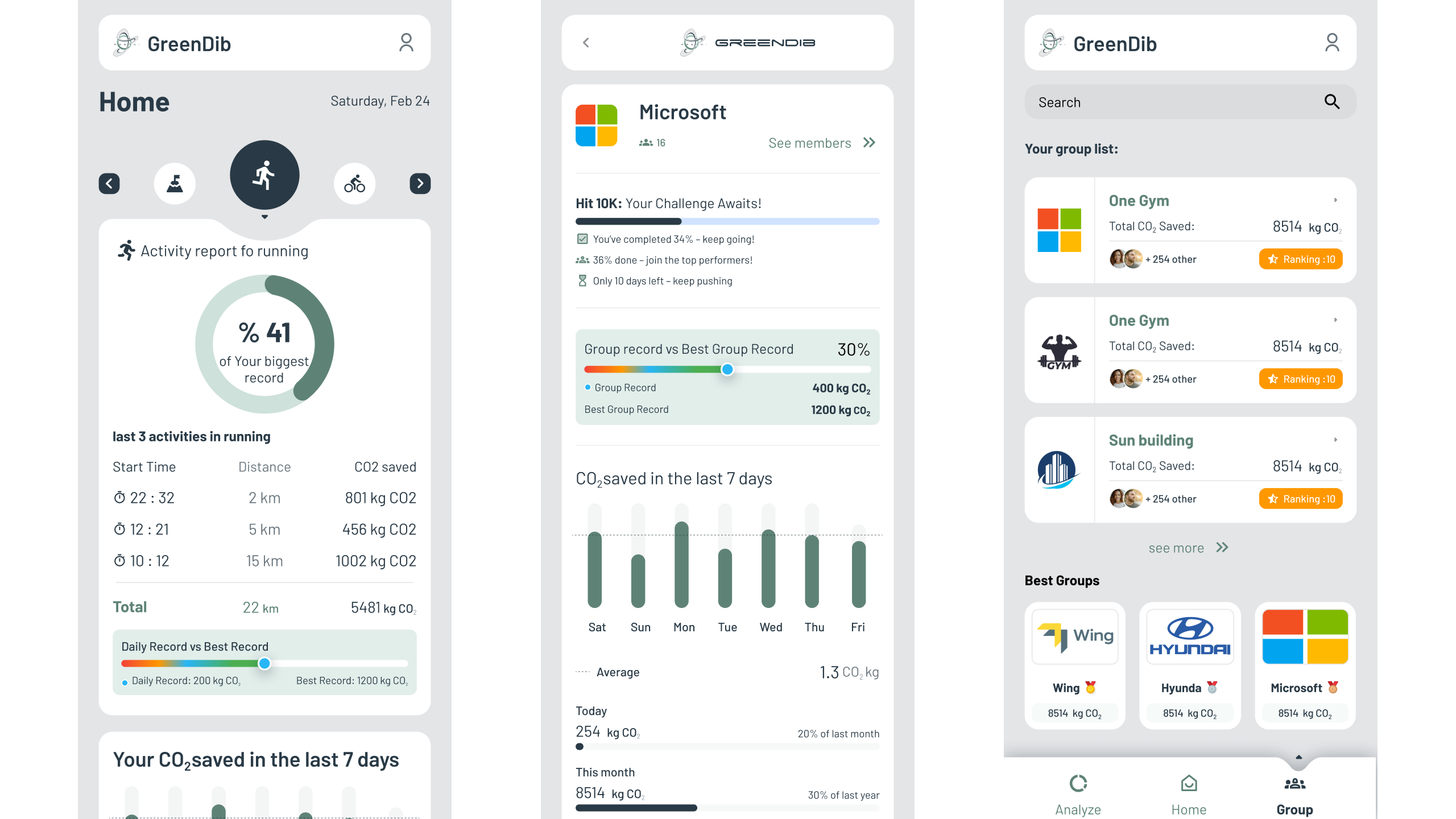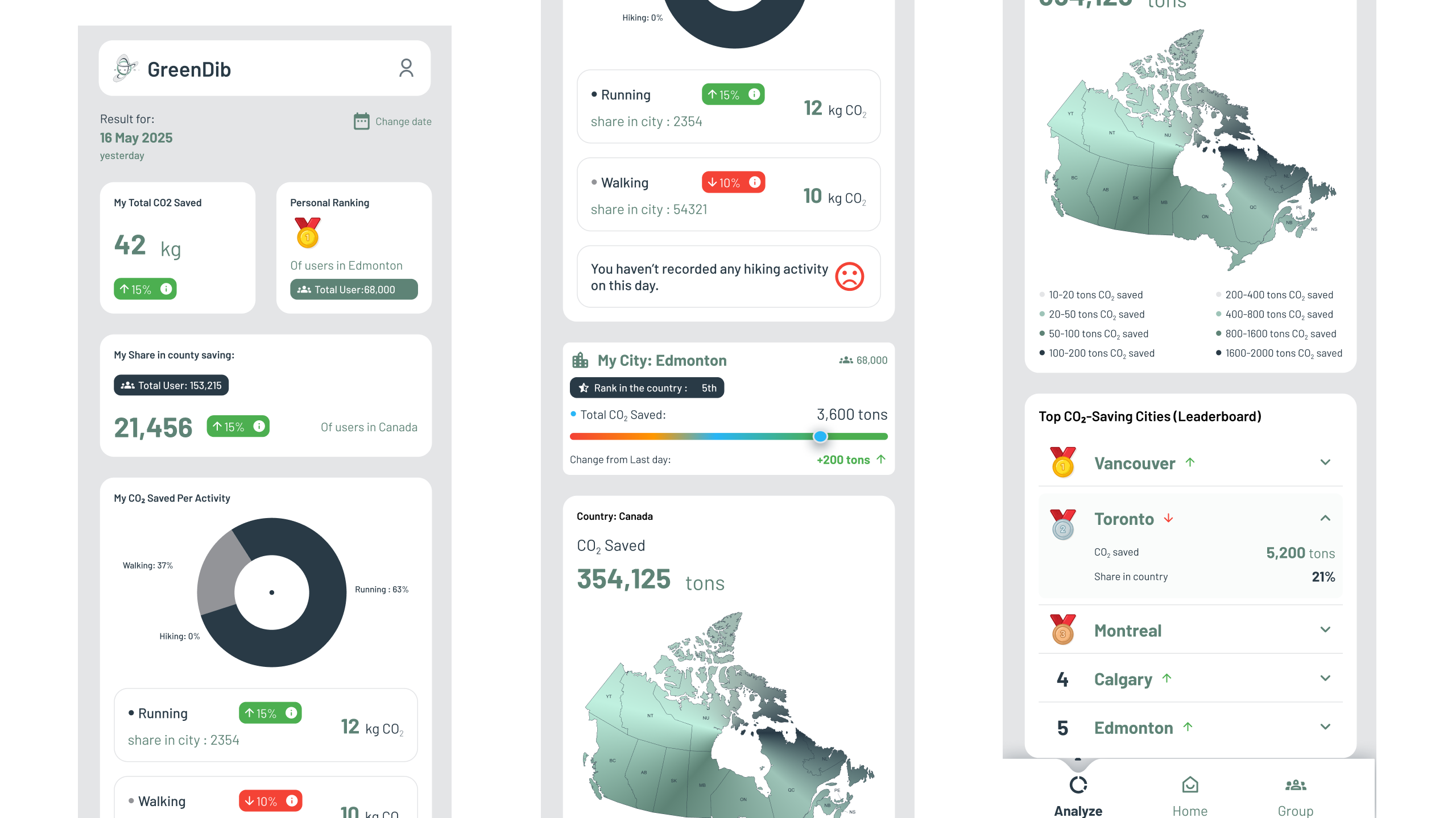 GreenDib is a sustainability-focused mobile application designed to encourage users to reduce their carbon footprint by tracking eco-friendly activities such as walking, cycling, and running. The app provides personal CO₂ savings reports, city-wide leaderboards, and group challenges, allowing individuals and organizations to compete in reducing emissions. The goal was to create a motivating and visually engaging platform that makes environmental responsibility both measurable and rewarding.